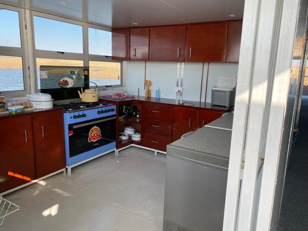 The houseboat is fully fitted with a bar fridge, a kitchen fridge with deepfreeze, and 2 chest freezers, ensuring plenty of space for food and refreshments. Malachite is solar powered with a backup generator for added reliability, making her both comfortable and sustainable on the water.
