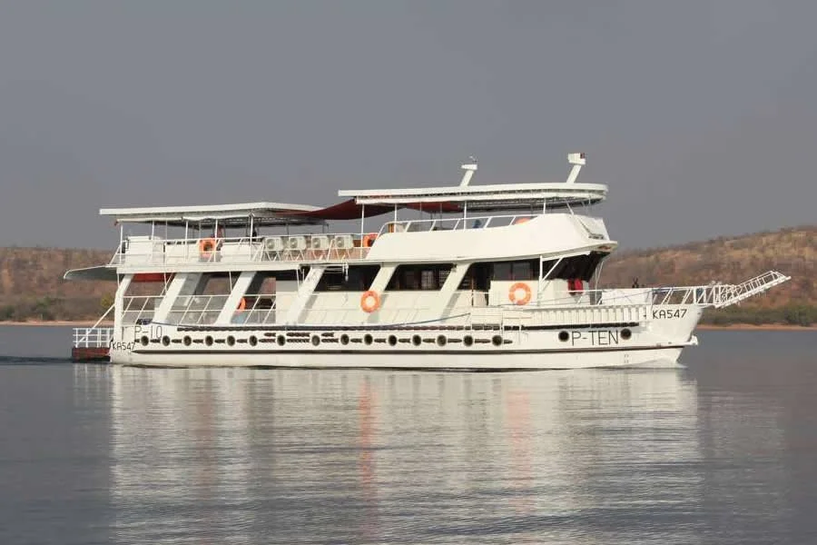 The P‑Ten is a sleek, 83‑foot luxury monohull cruiser that stands out for both speed and style—allowing you to reach destinations like Elephant Point or Tashinga Bay with time to spare for fishing or relaxation on day one. Powered by a Cummins N855M engine, it maintains a cruising speed of around 10 knots, ensuring smooth, comfortable transit across the lake. P‑Ten accommodates up to ten adults, four children, and four babies in an elegantly arranged five‑cabin layout. The cabins include a double en‑suite, four doubles with shared shower and basin, and an additional fold‑out single bunk above a double bed, plus convertible couches and top‑deck mattresses that expand sleeping to 24 when needed. Electrical power comes from a 7 kVA generator supplying 220 V, with square‑plug outlets throughout—though as government regulations require generator shutdown by 10 p.m., air conditioning isn’t available overnight. The crew of four comprised of a captain, a chef and two deckhands manages all operations, meals, and excursions. The vessel features two 12‑seater catamaran tender boats with 60 hp motors reserved for crew‑guided game drives and fishing trips. On the upper deck you’ll find a nine‑seater jacuzzi with a retractable awning, and inside there’s a bar area equipped with a CD player and iPod docking station. A separate 17 kVA three‑phase silent generator is also available when higher power is required. Guests board at noon and disembark at 10 a.m., with P‑Ten berthed at Glow Harbour near Andora Harbour. Whether you're chasing tigerfish or wildlife along the shoreline or simply soaking in Kariba’s golden sunsets from the deck, P‑Ten offers a refined yet adventurous lakeside experience.