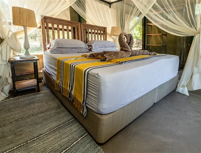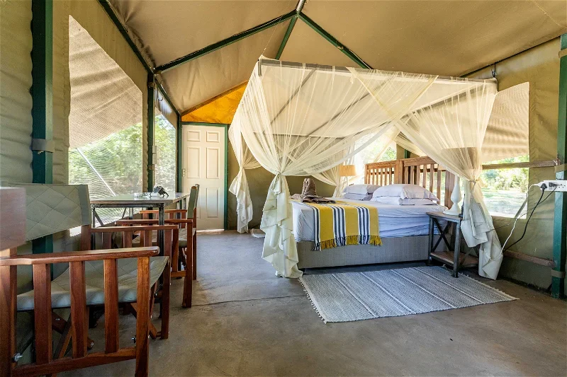 Nestled along the Zambezi’s tranquil banks in Mongwe, roughly 60 km upriver from Mana Pools, Rukuru Bush Camp offers a rare blend of intimacy and wild splendor. Set in a private, unfenced concession, the camp lies within 10,000 ha of pristine wilderness, granting guests exclusive access to mesmerising floodplains and the Zambezi River—wildlife wanders freely, often right through camp. With eight spacious, tented en-suite rooms (convertible from twins into king doubles), each equipped with hot and cold running water, mosquito nets, fans, and private verandas, this secluded hideaway balances comfort with raw beauty. At night, the gentle hum of nature replaces electricity, with solar lighting and cooling fans setting the stage for an authentic, peaceful retreat.