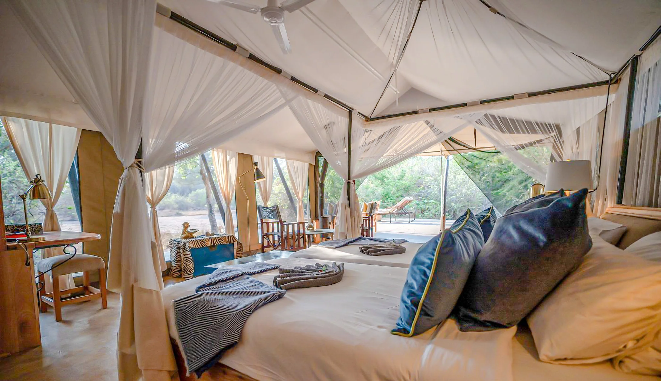 Sango Dadiso Safari Camp, nestled in the heart of the renowned Save Valley Conservancy, offers an exclusive and authentic safari experience where luxury meets wilderness. The camp is beautifully set along the banks of a seasonal river, blending seamlessly into its pristine natural surroundings. Each of the spacious tented suites is elegantly designed, featuring comfortable beds, en-suite bathrooms, and private verandas that open onto sweeping views of the bush. The camp’s intimate size ensures personalized service and a tranquil atmosphere, allowing guests to fully immerse themselves in the sounds and sights of the African wilderness.