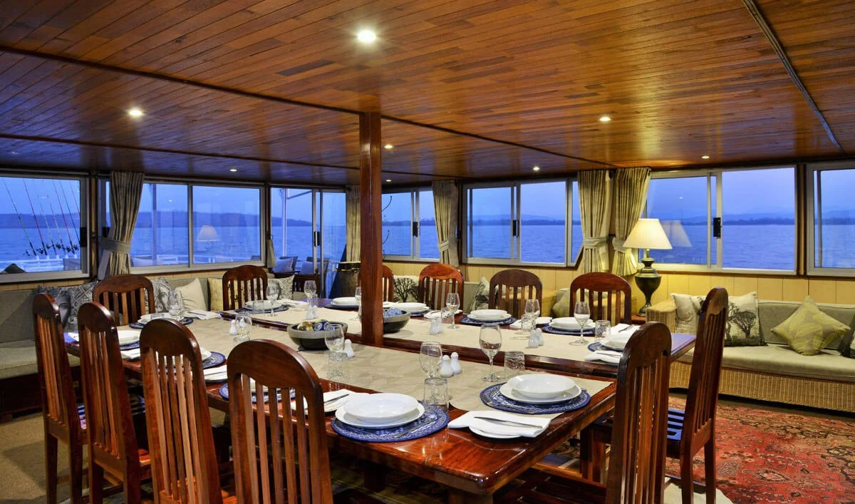 As night falls, the boat anchors in a quiet bay. The tender boats return from their evening runs, and the deck comes alive with laughter, stories, and the aromas of a chef-prepared meal under a starlit African sky.